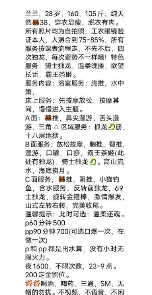 进屋环境温馨,能洗澡,有一次性浴巾一次性床单。3张花式服务,先是给抹精油胸滑,大白奶前前后后在身上摩 ...